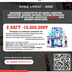 Admin 6/12/2025 Photo, Design 5 ХОВД АЙМАГ:Хөгжлийн бэрхшээлтэй иргэдэд зориулсан Стартап арга хэмжээ зарлалаа Хөгжлийн бэрхшээлтэй иргэдийн хөдөлмөр эрхлэлтийг дэмжих жилийн хүрээнд Хөгжлийн бэрхшээлтэй иргэдэд зориулсан Стартап арга хэмжээ зарлаж байна. ЗОРИЛГО:Ховд аймгийн хэмжээнд хөгжлийн бэрхшээлтэй хүнийг хөдөлмөр эрхлэх, хувиараа үйлдвэрлэл, үйлчилгээ эрхлэх, тэдгээрийн онцлог хэрэгцээнд нь нийцсэн ажлын байр бий болгох анхан шатны санхүүжилтийг олгох, бизнес санааг нь сурталчлан таниулах, дэмжихэд оршино. Уралдаанд хэн хамрагдах боломжтой вэ?-Хувиараа хөдөлмөр эрхлэгч хөгжлийн бэ 6/12/2025