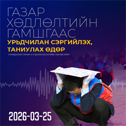 Admin 3/25/2026 Photo, Design 5 Газар хөдлөлтийн аюулаас урьдчилан сэргийлэх, таниулах өдөр тохиож байна Монгол Улсын Засгийн газрын 2017 оны 67 дугаар тогтоолоор жил бүрийн гуравдугаар сарын дөрөв дэх долоо хоногийн Лхагва гарагийг “Газар хөдлөлтийн аюулаас урьдчилан сэргийлэх, таниулах өдөр” болгосон. Үүнтэй холбогдуулан өнөөдөр /2026.03.25/ улс орон даяар энэ өдрийг ес дэх жилдээ тэмдэглэн өнгөрүүлж байна.“Газар хөдлөлтийн гамшгаас урьдчилан сэргийлэх, таниулах өдөр”-ийн хүрээнд төв, орон нутгийн Онцгой байдлын байгууллагаас иргэд, олон нийтэд зориулсан сургалт, дадлага зохион байгуулж байна. Мө 3/25/2026