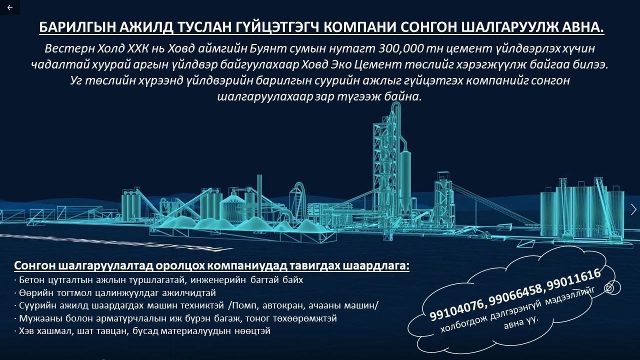 "Вестерн холд" ХХК нь Ховд аймгийн Буянт сумын нутагт 300 000 тонн цемент үйлдвэрлэх хүчин чадалтай, хуурай аргын үйлдвэр байгуулахаар "Ховд эко цемент" төсөл хэрэгжүүлж байгаа билээ. Уг төслийн хүрээнд үйлдвэрийн барилгын суурийн ажлын ажлыг гүйцэтгэх компанийг сонгон шалгаруулна. Огноо: 2/11/2020 Төрөл: Ажлын байр Сэтгүүлч: Н.Батчимэг, Н.Лхагва 4001 Мэдээ таалагдсан: