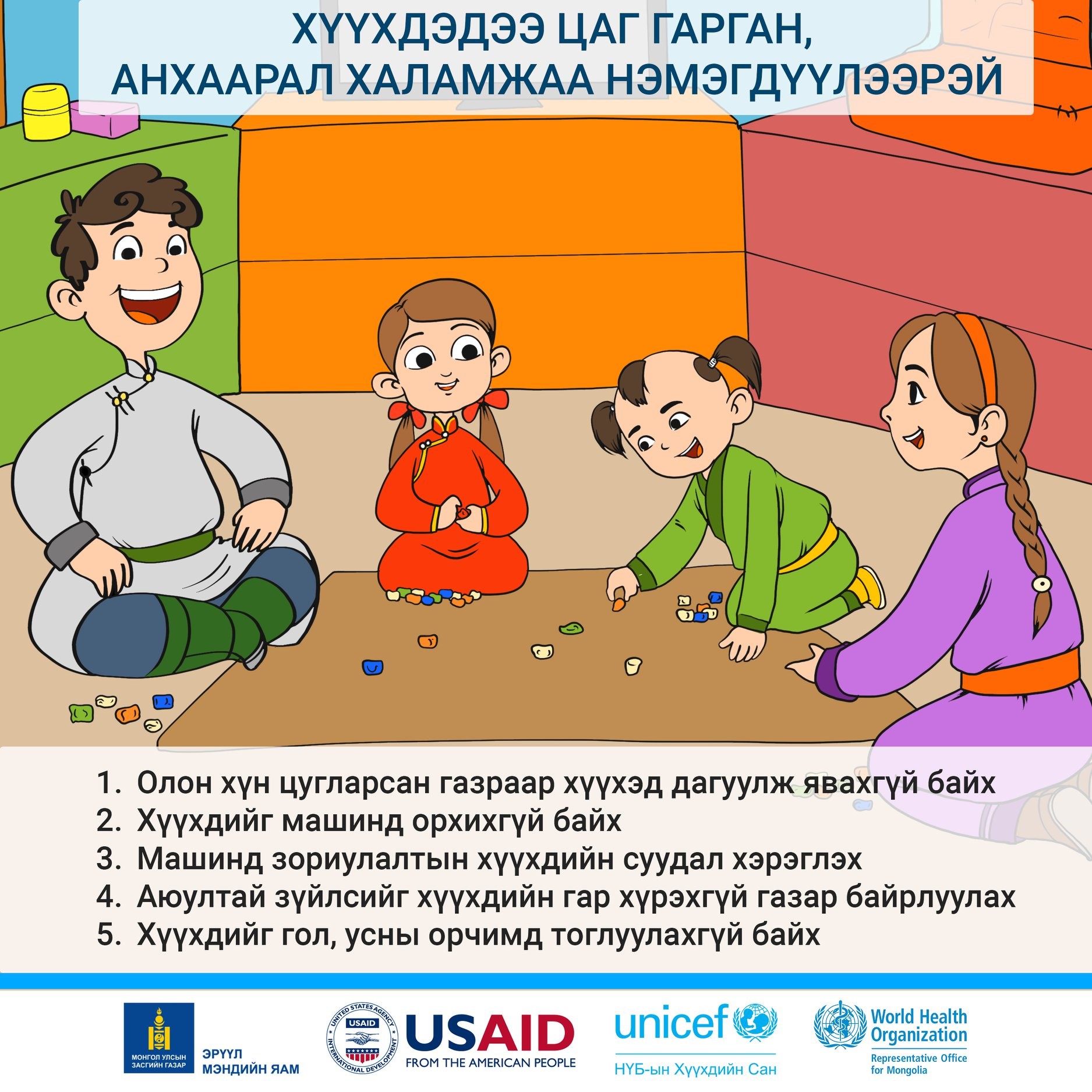 - Аюултай зүйлсийг хүүхдийн гар хүрэхгүй газар байрлуулах