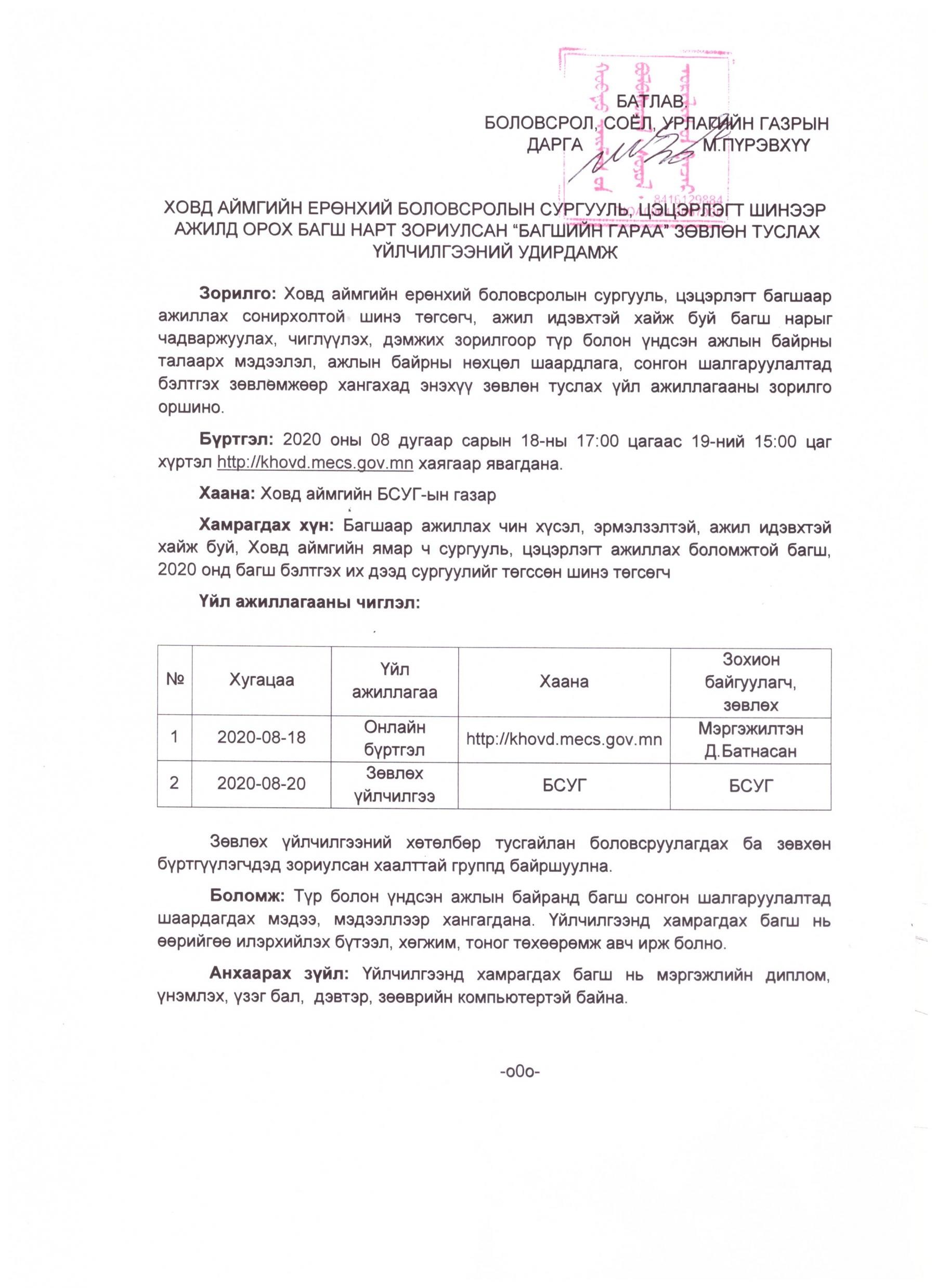 БСУГ-аас ерөнхий боловсролын сургууль, цэцэрлэгийн багшийн ажлын байранд орох хүсэлтэй ажил идэвхтэй хайж буй багш, шинэ төгсчдөд зориулсан зөвлөх үйлчилгээг 2020 оны 08 дугаар сарын 20-ны өдөр зохион байгуулахаар төлөвлөж байна. Иймд дараах удирдамжийн дагуу