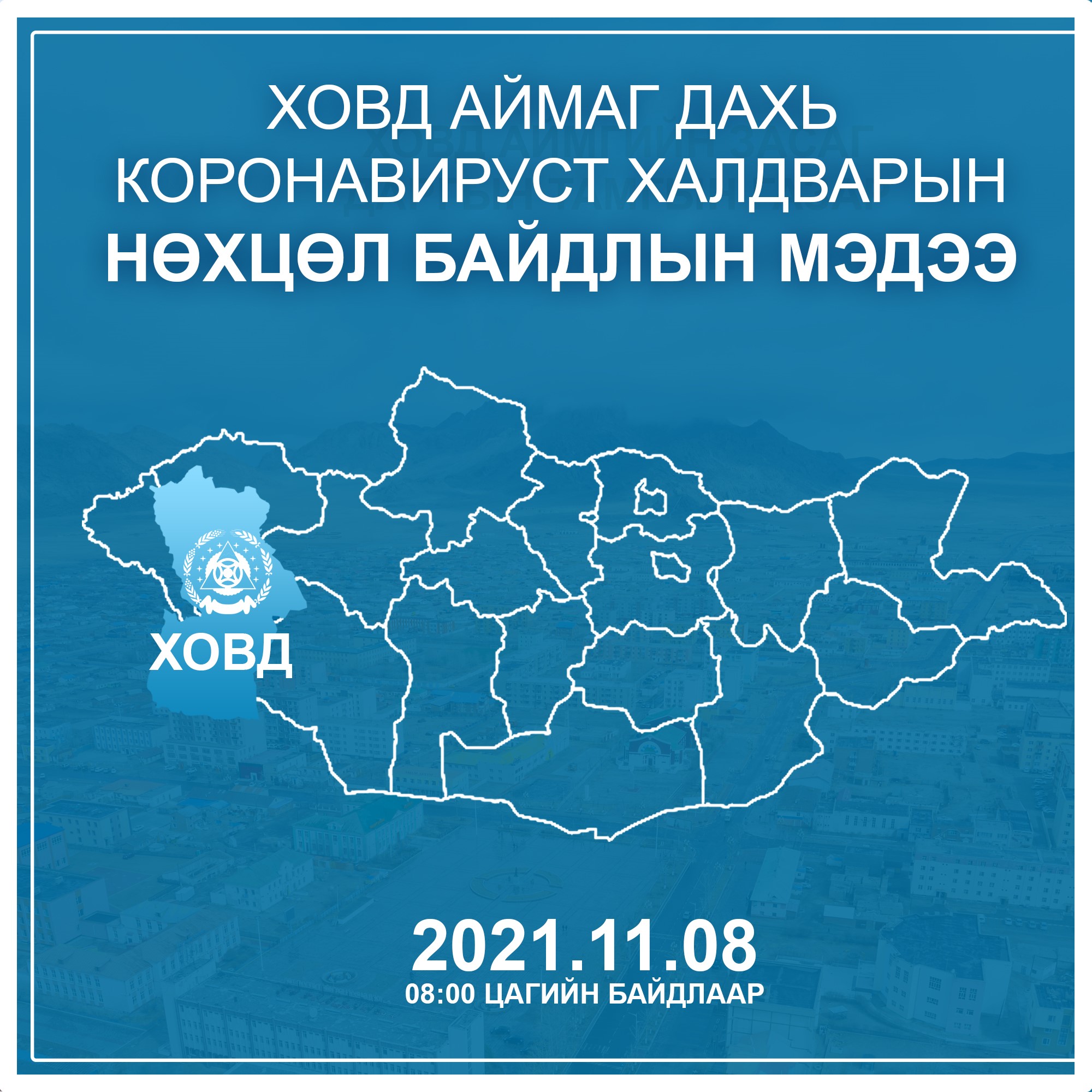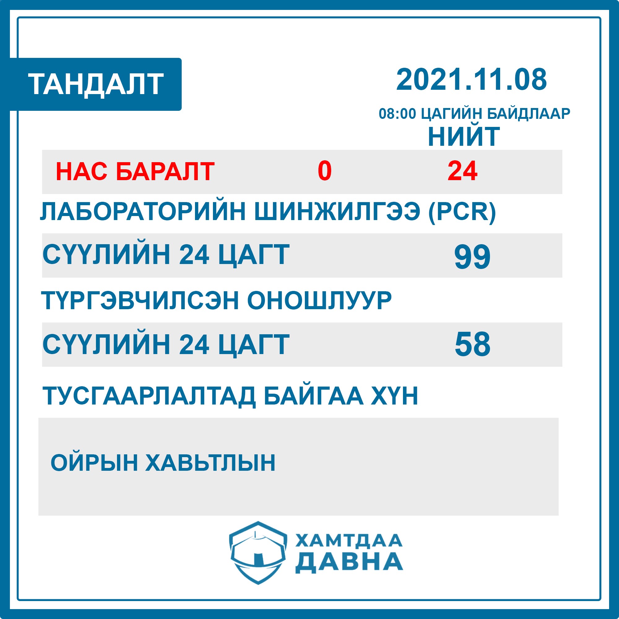 2021 оны 11 дүгээр сарын 07-ны 08:00 цагаас 11 дүгээр сарын 08-ны 08:00 цаг буюу сүүлийн 24 цагийн хугацаанд нийт 58 сорьцод түргэвчилсэн оношлуураар шинжилгээ хийхэд 23 эерэг, 99 сорьцод PCR шинжилгээ хийхэд 11 эерэг гарчээ. Коронавируст халдварын батлагдсан тохиолдол 34-өөр нэмэгдэж нийт 18889 боллоо.